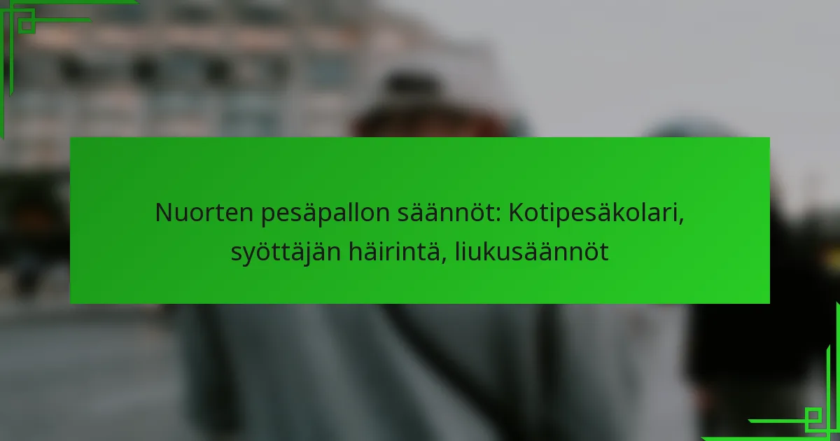 Nuorten baseball-säännöt, jotka koskevat kotipesän törmäyksiä, syöttäjän häirintää ja liukumista, ovat olennaisia pelaajien turvallisuuden ja reilun kilpailun varmistamiseksi. Kotipesän törmäyssäännöt pyrkivät suojaamaan syöttäjiä vaarallisilta iskuilta, kun taas syöttäjän häirintä käsittelee tilanteita, joissa syöttäjät estävät lyöjiä. Lisäksi liukumissäännöt voivat vaihdella liigan mukaan, joten on tärkeää, että pelaajat ja valmentajat ymmärtävät pelinsä sääntöjä.