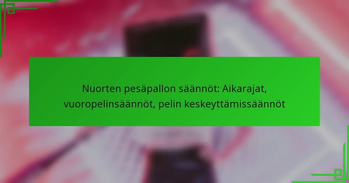 Nuorten baseballissa on erityisiä sääntöjä aikarajoista, vuoropelien sääntelystä ja pelin keskeyttämisestä, jotka parantavat nuorten pelaajien kokemusta. Aikarajat vaihtelevat tyypillisesti 1,5 – 2 tuntiin, mikä edistää sitoutumista ottaen huomioon urheilijoiden kehitystarpeet. Vuoropelien säännöt vaihtelevat ikäryhmittäin, varmistaen sopivan pelin, kun taas pelin keskeyttämissääntöjen ymmärtäminen on olennaista turvallisuuden ja jatkuvuuden ylläpitämiseksi odottamattomien keskeytysten aikana.